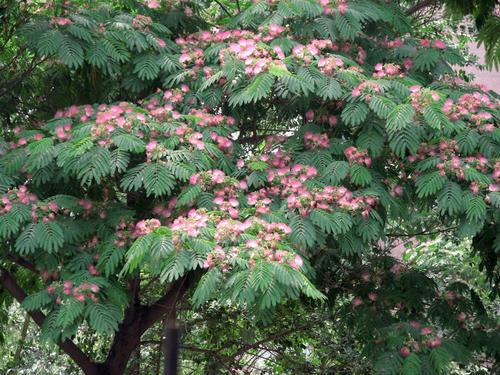 夏天,太阳像个大火球炙烤着大地,合欢树就用它那浓密的树荫为人们遮挡阳光的曝晒,同学们在树下读书,做游戏------遇着下雨天,还可以在树下临时避雨,合欢树就把它的绿叶织得密密的,不让一滴雨珠滴在人们头上。