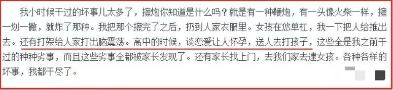初中那会就已经如此花心,到了高中亦是变本加厉,将鞭炮扔进别人衣服、把人打成脑震荡、擦枪走火让女生去堕胎,用他自己的话说,“几乎把坏事都干尽了”。