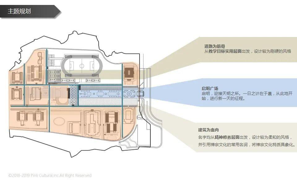 项目组成员整理提炼出学校实地调研资料,进行头脑风暴式的交流。针对学校的特性和文化精神内涵,确定学校的主题及定位,再对学校区域进行整体性规划。