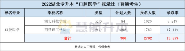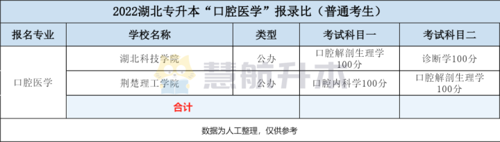 2022年,共有2所院校“口腔医学”专业招生,分别是湖北科技学院、荆楚理工学院。