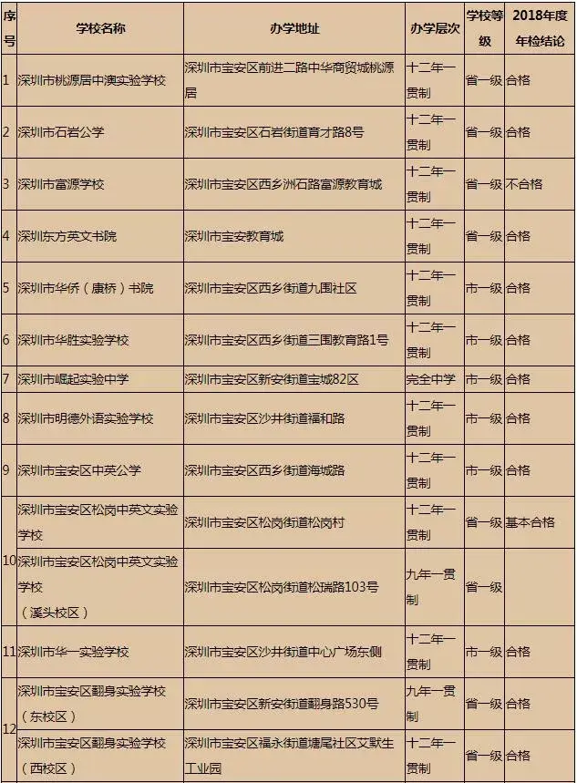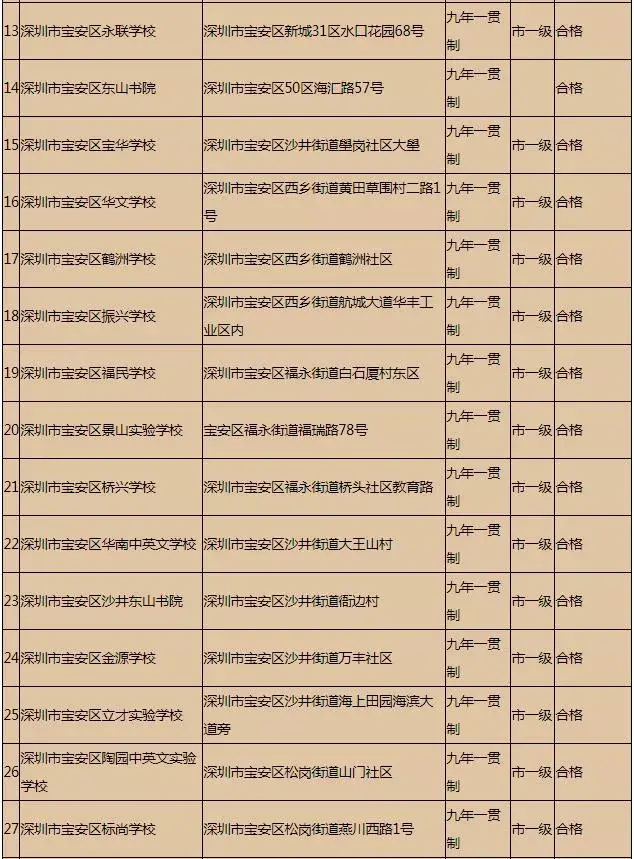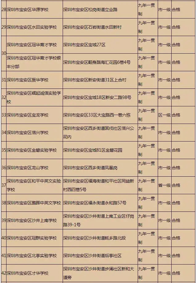 其中深圳市宝安区松岗中英文实验学校、深圳市宝安区翻身实验学校、深圳市宝安区冠华育才学校有2个校区,分校区统计:十二年一贯制11所,九年一贯制39所,小学13所,完全中学1所、高中1所。