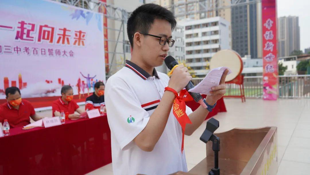 优秀学生代表刘懿作分享性发言,“中考注定是没有'硝烟的战争 ',而我们生来就是为此而战的'战士 ',希望同学们能够紧握宝剑、勇往直前、全力冲刺、直上云霄。”