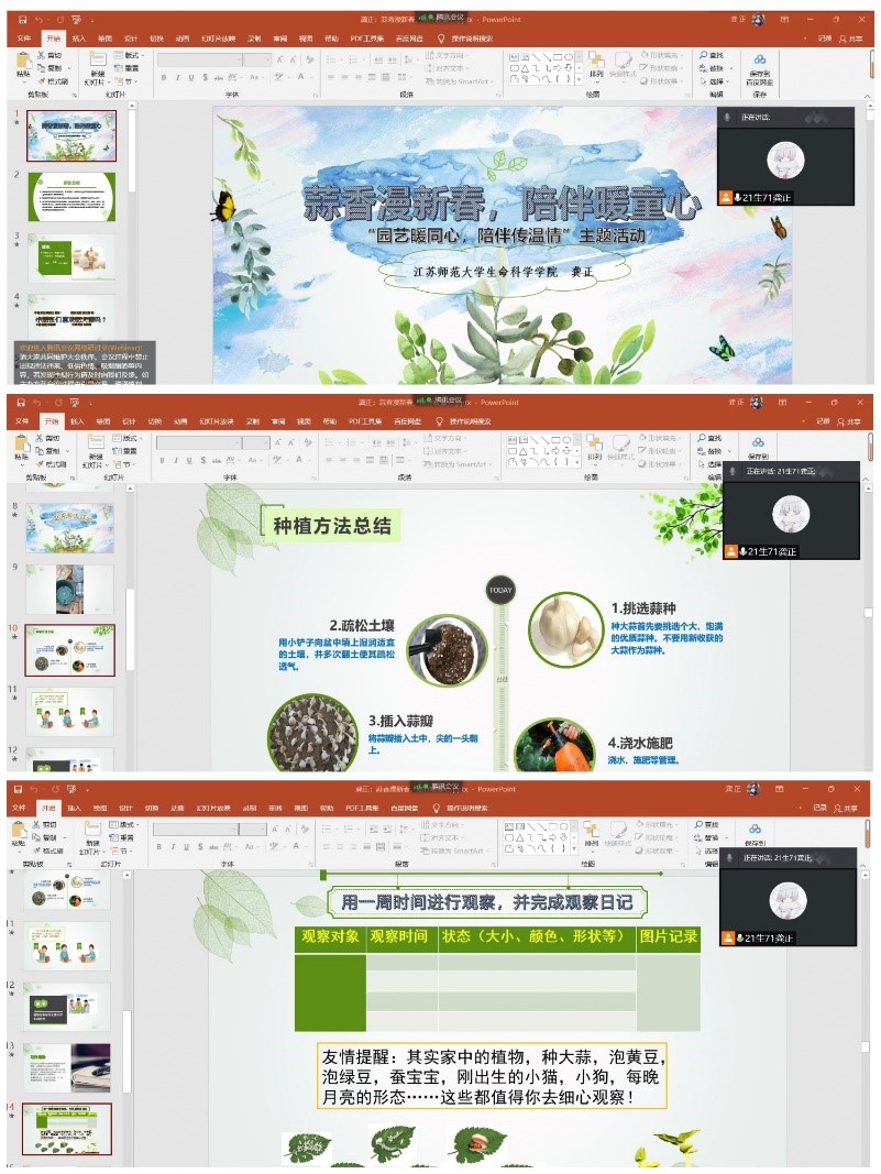 摘 要:利用线上腾讯会议,线下现场教学,并与社区负责留守儿童问题的工作人员和乡村小学老师携手,多方联动。通过前期躬亲实践栽培蒜苗,新冠病毒知识科普,在教授孩子们种植大蒜学会植物栽培技巧的同时,普及新冠病毒防控知识,培养孩子们的生活习惯。积极鼓励孩子们用自己的语言记录下大蒜生长的过程,培养观察和实践能力,提高了孩子们的习作水平,也激发了孩子们热爱生活,勇于实践的精神。指导孩子们通过亲自种养植物,结合生活经验,运用观察、比较、分析、推理等科学方法,真实体验植物生长对水和阳光的需求,体会生命的意义,培养热爱自然、关爱生命的情感。认识到植物的生存和生长离不开环境,初步形成事物是相互联系的认识。让孩子们在心与心的交流中感受到爱与陪伴,让志愿者在实践活动中领悟到家人陪伴的重要性。