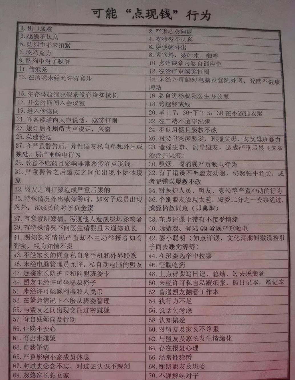 还有一些规定被戏称是“点现钱”,一共86条,触犯了任何一条都会被立马带去13号治疗室,而每一次杨永信都会收取200元的费用。