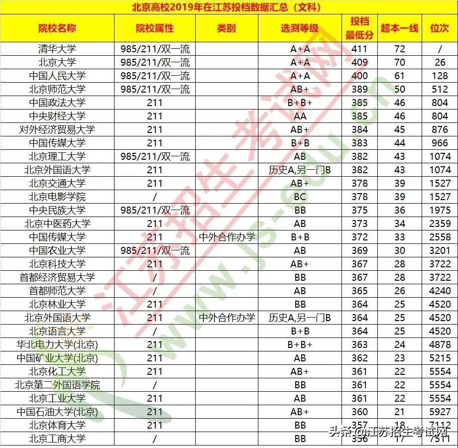 2、北京共有8所985高校,都在江苏进行招生。江苏考生想上985高校,理科要在全省前10427,文科要在全省前3201名。
