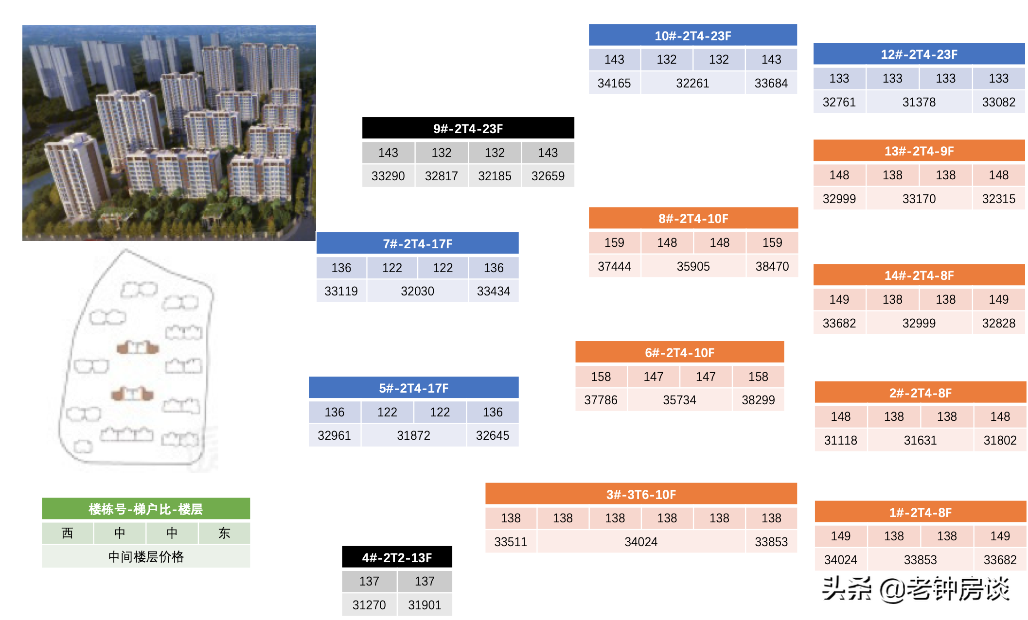 上图左上角是鸟瞰图,左下是楼栋分布图,右半部分是户配楼栋号楼层以及单元中间楼层备案价格。如果看不懂,我在左下角用绿色表格做了一个示范。