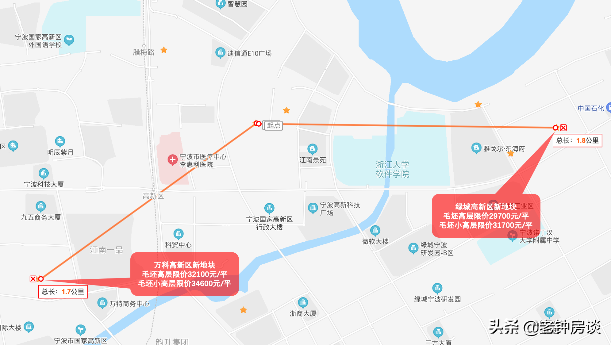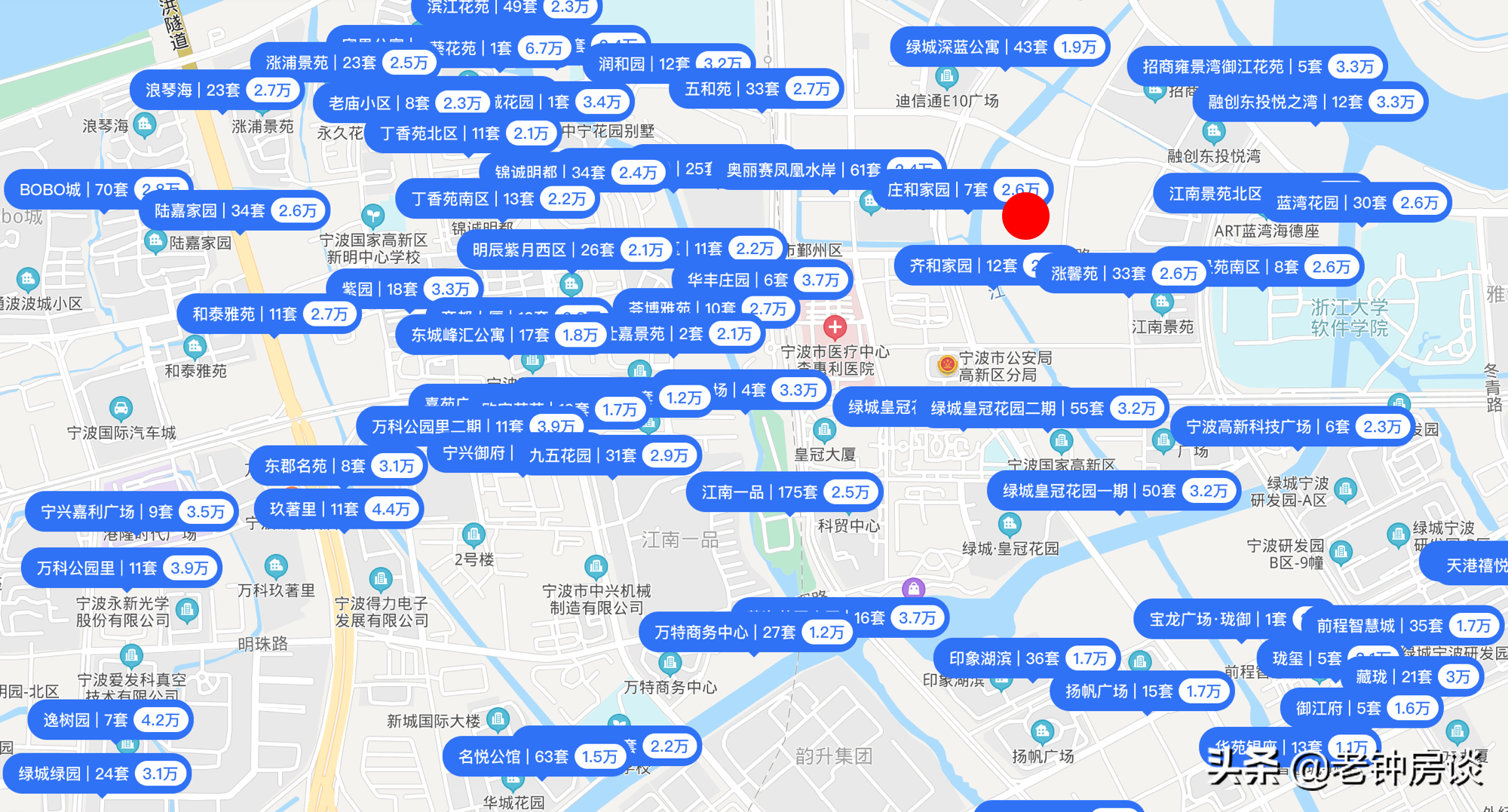 上图红色圆为大成郡三期位置,7月取证批次预售均价为33546元/平。周边二手房大部分挂牌价要比这个价格低,招商和融创的楼盘接近。公园里和逸墅价格接近4万,但是人家更靠近老江东,老宁波人更认可那个地段。