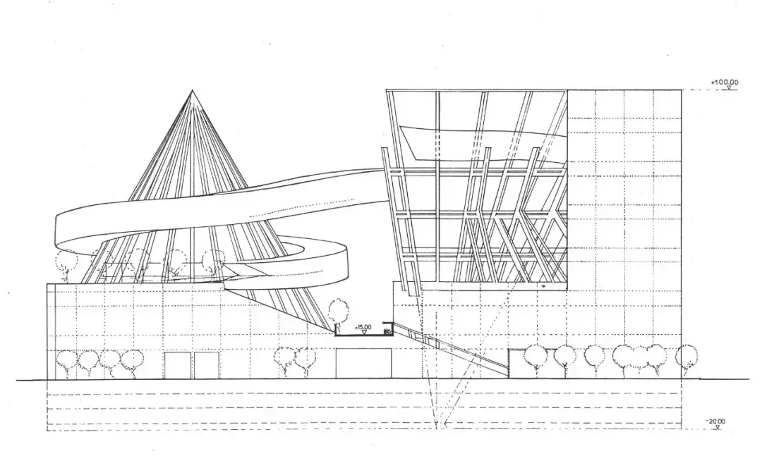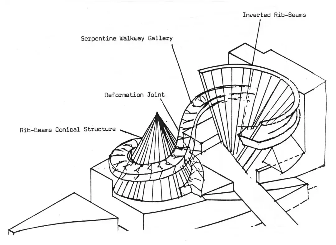 一个正向的圆锥体与一个倒置的圆锥体并置,靠在主要的矩形建筑物上,蛇形的画廊将两个椎体相连结。