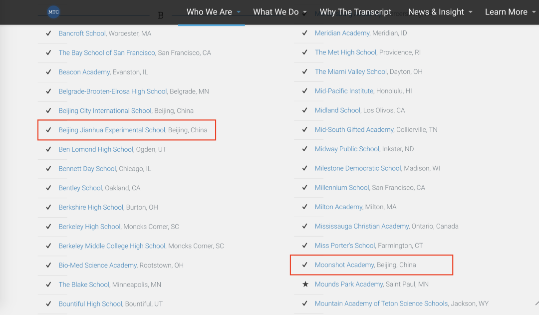 据新学说了解,探月学院和提雅学园都是MTC联盟的成员,这是由美国顶尖高中组成的MTC联盟(MasteryTran Consortium)推出的学生评价系统——素养成绩单(Mastery Tran),不仅可以反映学生在学习期间通用素养的发展情况,还可以用来申请近百所名校。其内容包括: 科学与数学、艺术、健康与体育、可迁移技能、沟通能力、国际公民、跨学科文字素养。