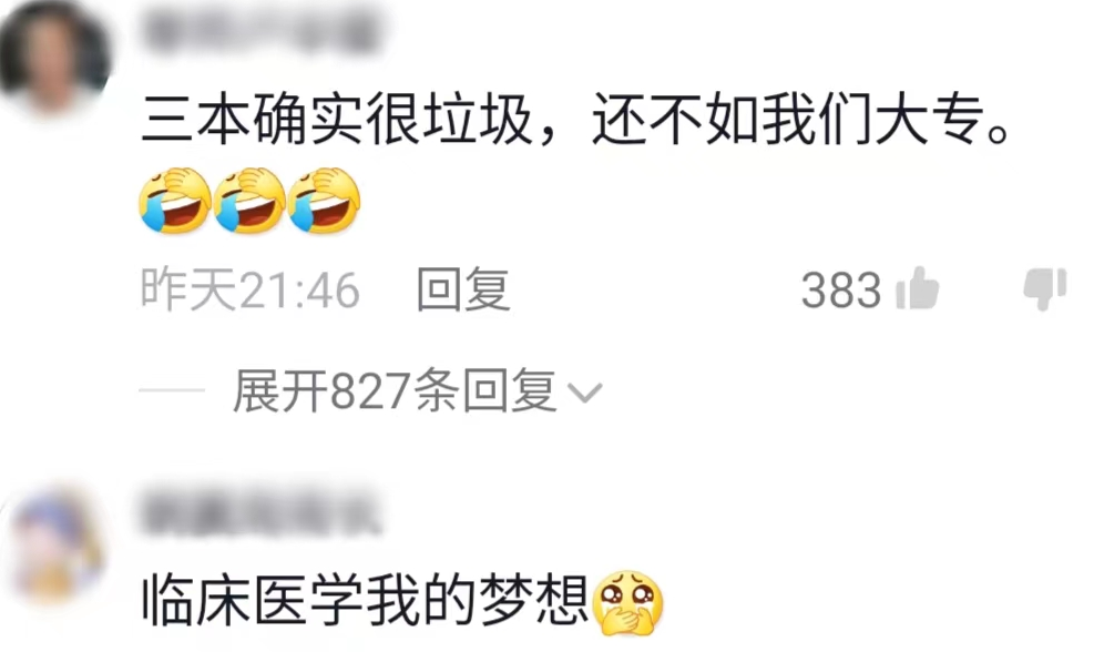 还有人说让三本生去当医生,能力能过关吗?值得信任吗?也有人表示:三本确实很不行,还不如我们大专,总之对三本上的能力充满质疑,除了质疑能力外,还有人在讽刺他的学历。
