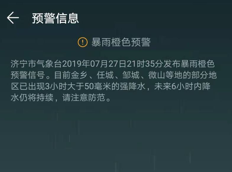 目前金乡、任城、邹城、微山等地的部分地区已出现3小时大于50毫米的强降水,未来6小时内降水仍将持续,请注意防范。