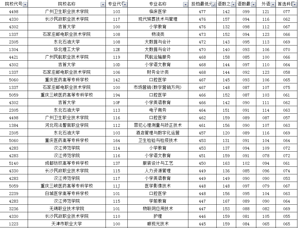 投档分最高的是天津医药高等专科学校的口腔医学专业,最低投档分达到了488分之高,超过了本科线77分。的确,该考生的这个分数,如果一定要学医的话,在本科批次只有昆明医科大学海源学院、三峡大学科技学院、锦州医科大学医疗学院、湖北恩施学院等独立学院或民办院校的临床医学专业可选,如此的话,很多的考生都会倾向于专科批次的强势院校的医学专业。当然,如果考生可以接受其它的专业,那他完全可以在本科公办院校中有比较好的选择,比如重庆科技大学、重庆文理学院、湖南工业大学等高校的部分专业。