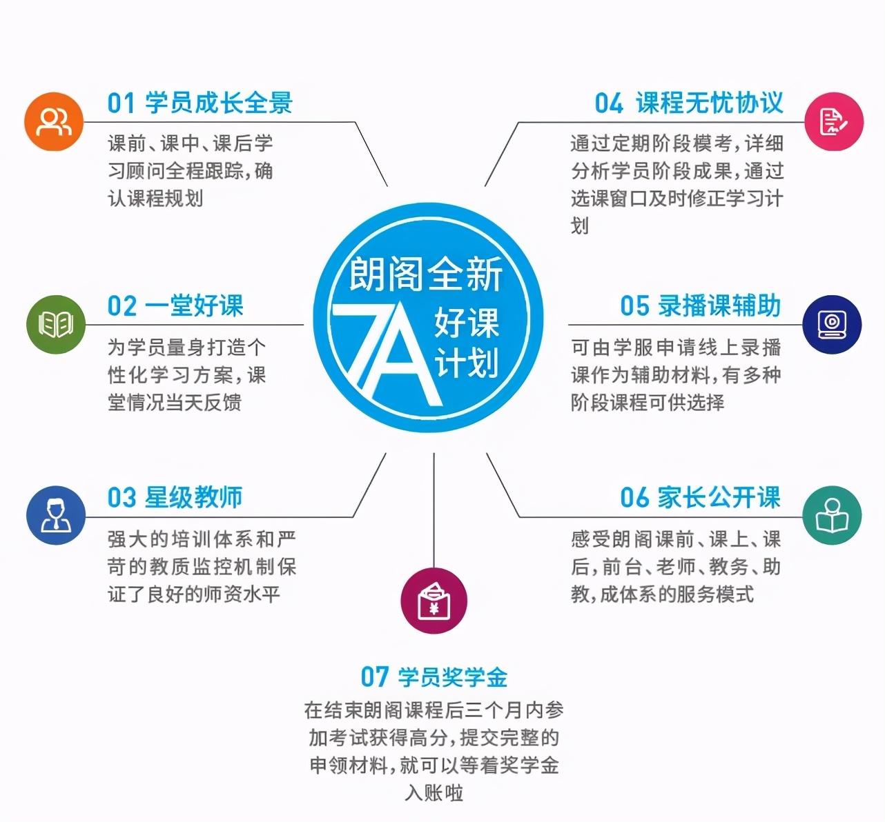 7A好课计划:从课前、课中、课后为学员提供系统性服务,细化服务流程,升级服务内容,确保朗阁学员均能获得A类优质服务体验。