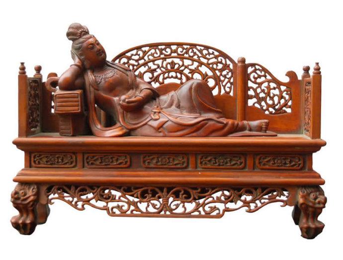 朱金木雕尤以神佛像雕刻最负盛名。它着重刻画神佛的面相,既突出佛神仪表的庄严,又善于表现其和蔼可亲的神态。朱金木雕中,家具装饰特别是婚娶喜事中的床和轿,更具地方特色,表现出一种富丽堂皇的气派,故有“万工轿”“千工床”之誉。宁波人常说:“一生做人,半世在床”,所以,对木床的雕刻装饰,特别讲究。