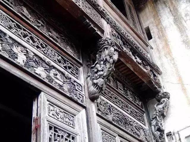 现今,在古徽州所辖县内木雕精品仍然随处可见。款县黄村一家民宅,在梁、仿、榇、斗拱、雀替上全部精雕细刻,装饰着灵兽、百鸟、蝙蝠和回文图案,布局严谨,造型优美。楼下围着天井的24届镂花隔后门,上半部是连续图纹漏窗,下半部是浮雕花鸟隔板,连接上下两半部的中间横板,则雕刻着戏曲故事,内容皆出自《三国演义》戏文。