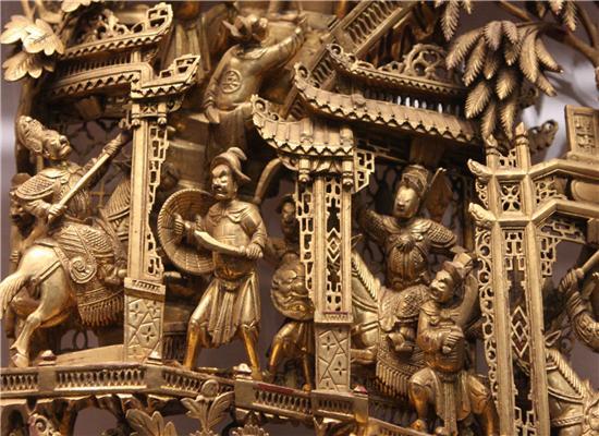 金漆木雕最初是我国古代的一种建筑装饰艺术,流传到南方后,又受到某些地方艺术特色的影响形成为一种木雕流派。它已有几百年的历史。用金漆木雕来装饰房屋和庙宇的栋梁、物椽、门楣以及家具等,显得金碧辉煌,给人以富丽庄严之感。