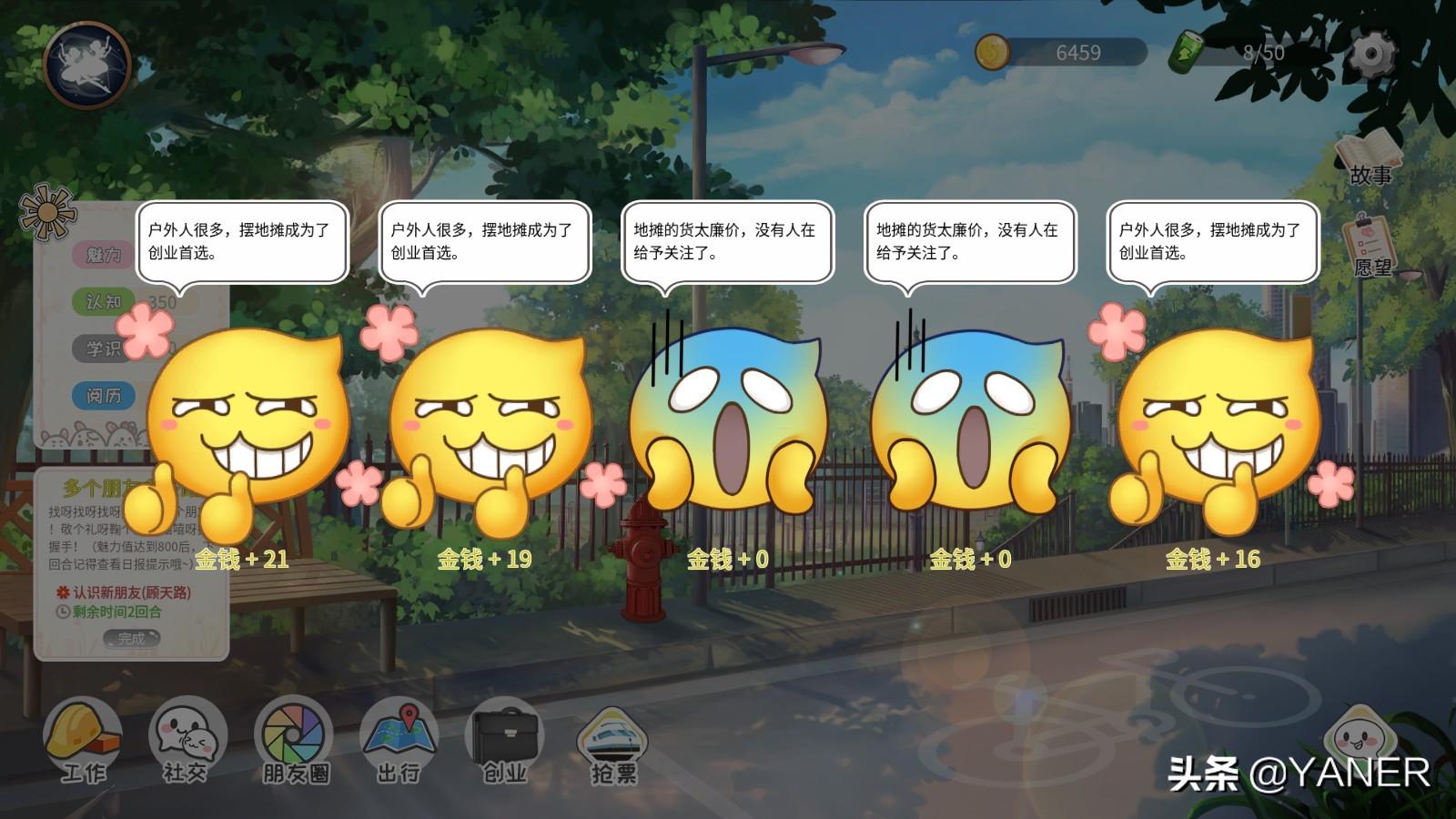 出行可以遇到事件,探索人物故事,不过探索有可能失败,得到的只有谢谢惠顾,还会消耗体力,创业在各个环境可进行的创业工作不同,比如家里可以游戏直播,而外面街道可以摆地摊,进行兼职,需要快速点击快捷键。这部分给我的感觉也很常见。