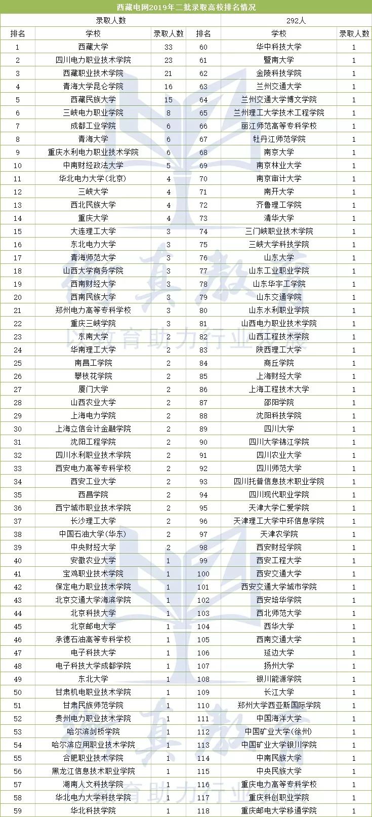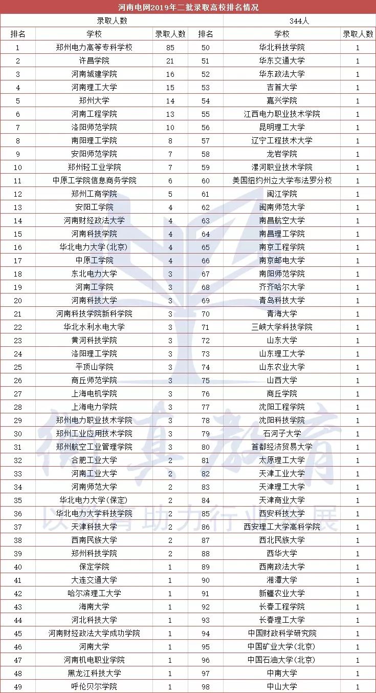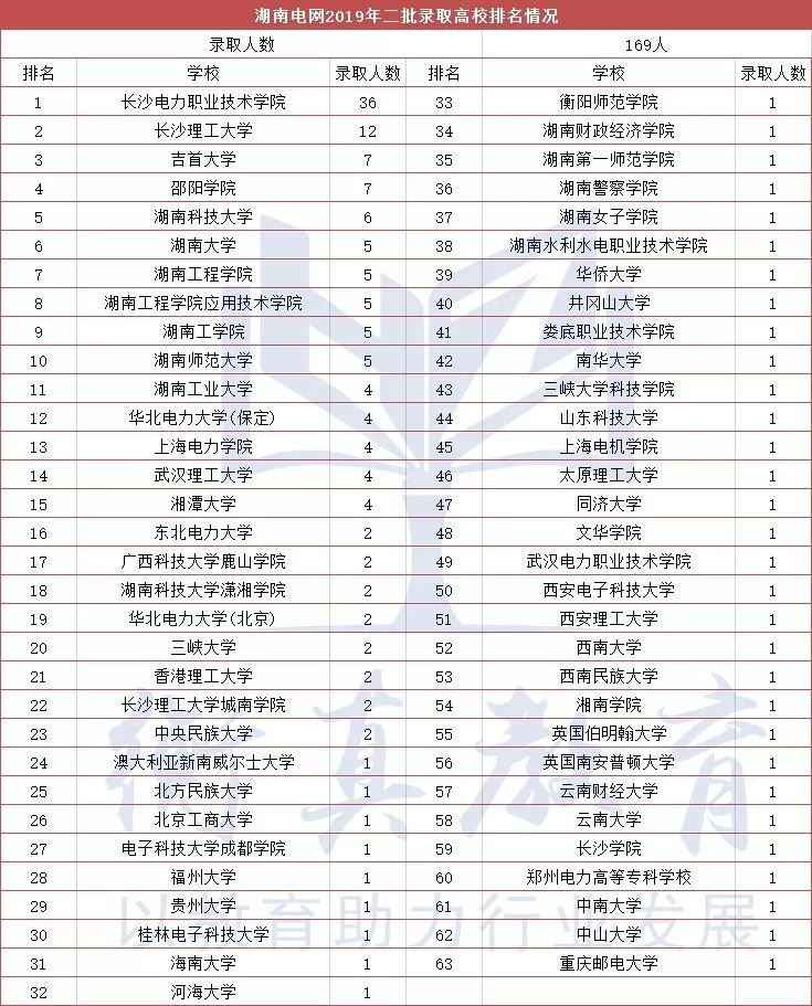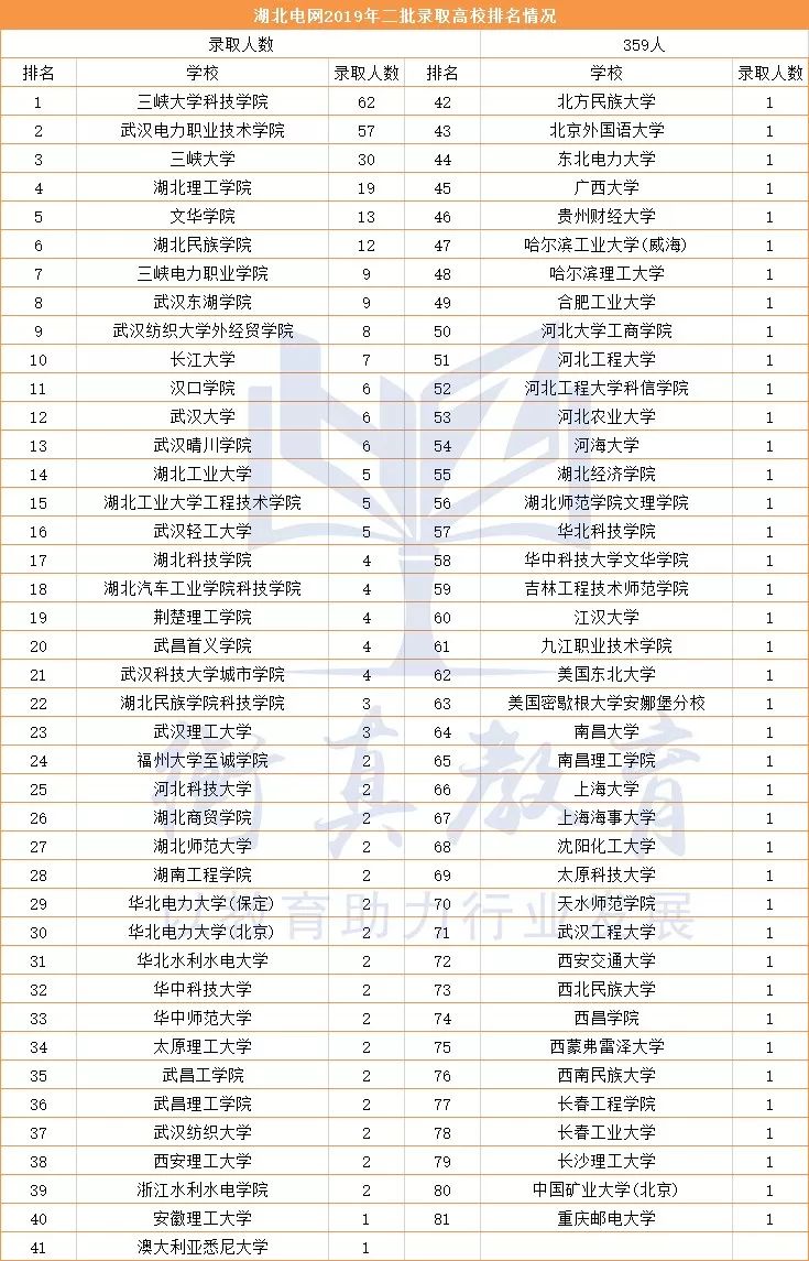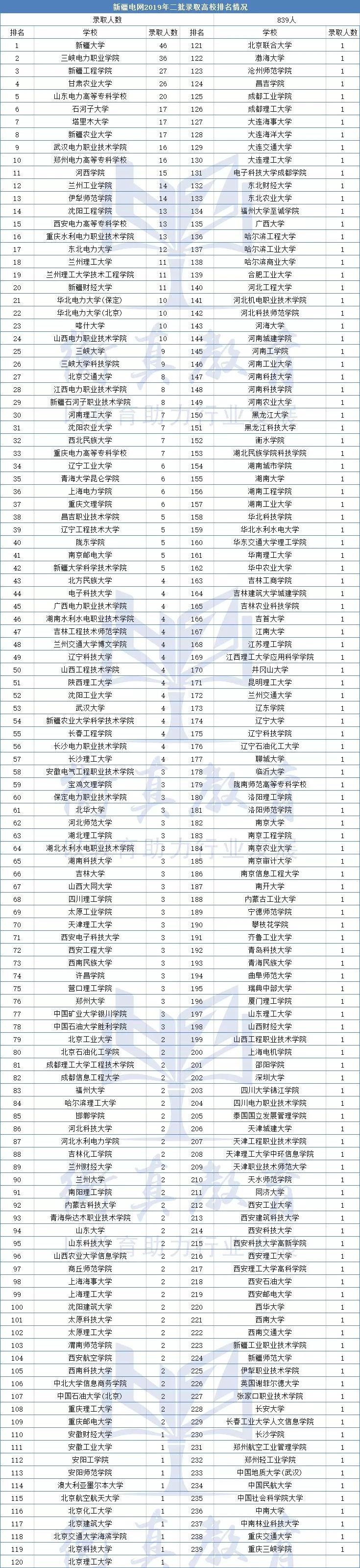 2019年二批共录取5994人,录取学校数达730所,新疆省电力公司、江苏省电力公司以及四川省电力公司分别以839人、710人、385人的优势占据实际招收人数排行榜前三。
