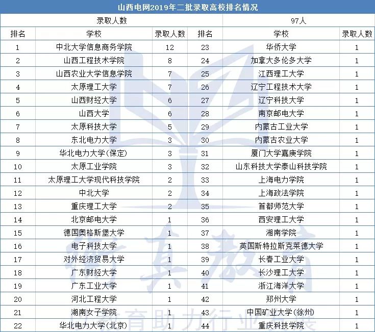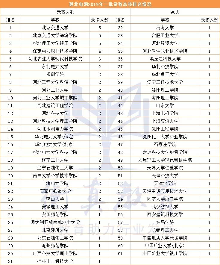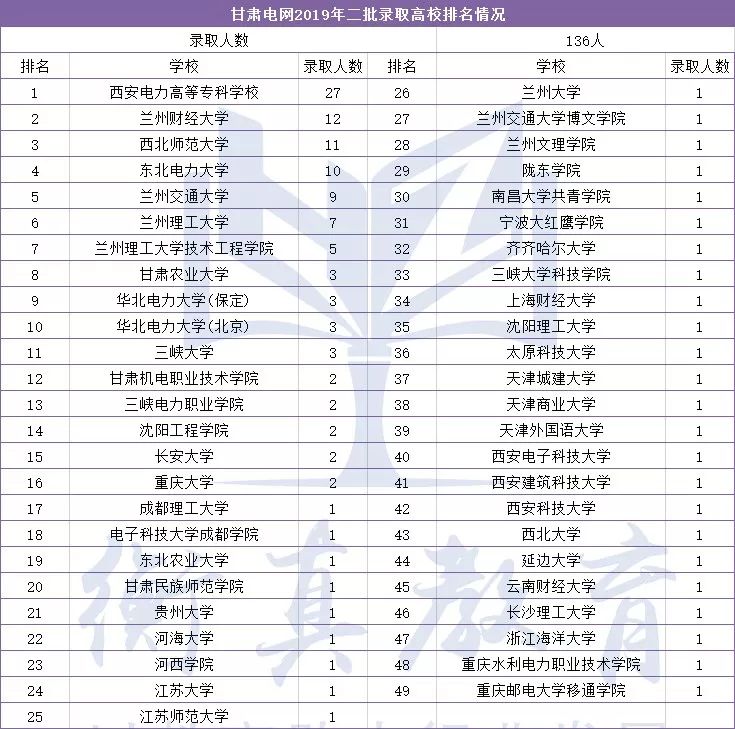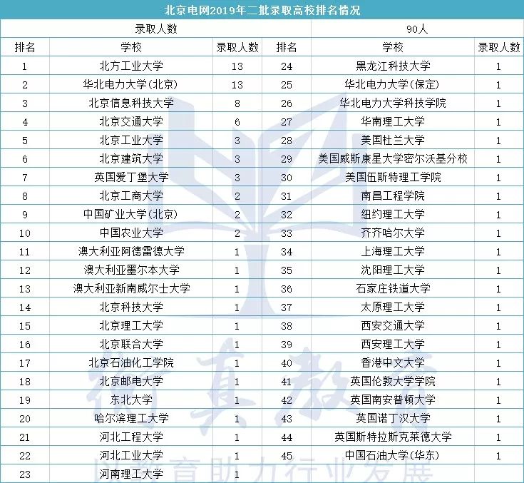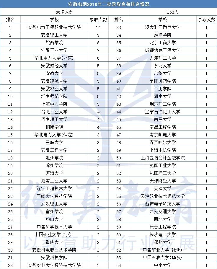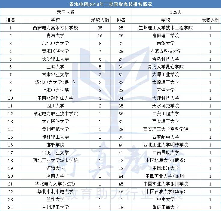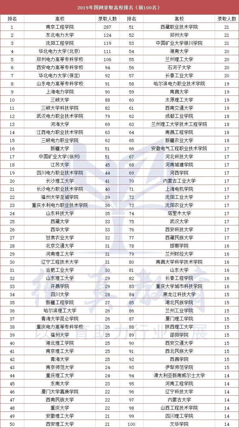 2019年二批共录取5994人,录取学校数达730所,新疆省电力公司、江苏省电力公司以及四川省电力公司分别以839人、710人、385人的优势占据实际招收人数排行榜前三。