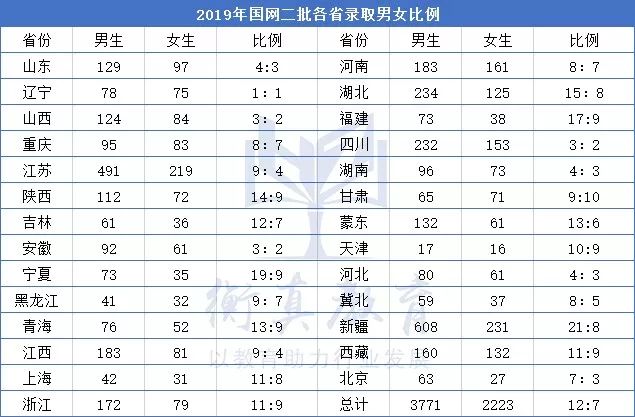 从整体上来看,今年录取男生3771人,女生2223人,总比例12:7,本次招聘只有甘肃省公司女生多于男生,有些省份录取男女比例能达到1:1,从数据中也反映出二批招收非电类比较多,尤其是财会和计算机类。
