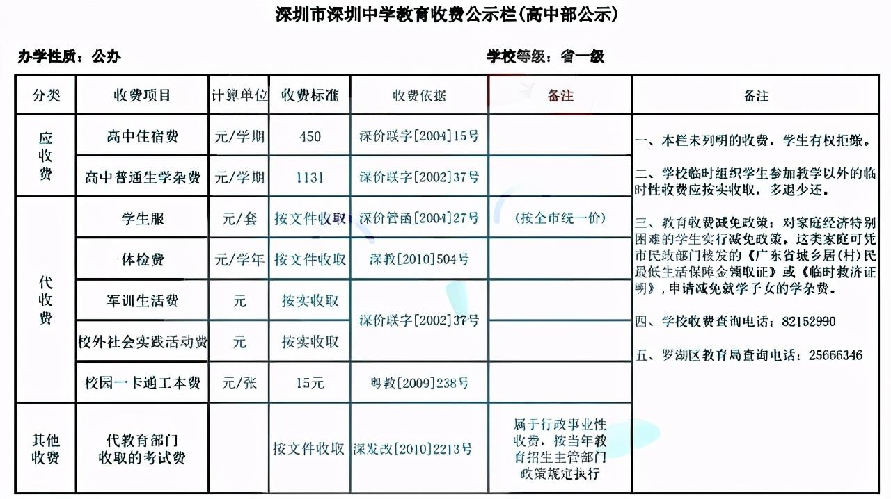 深圳公办高中学费是统一的,按市物价局核定的公办学校收费标准执行: