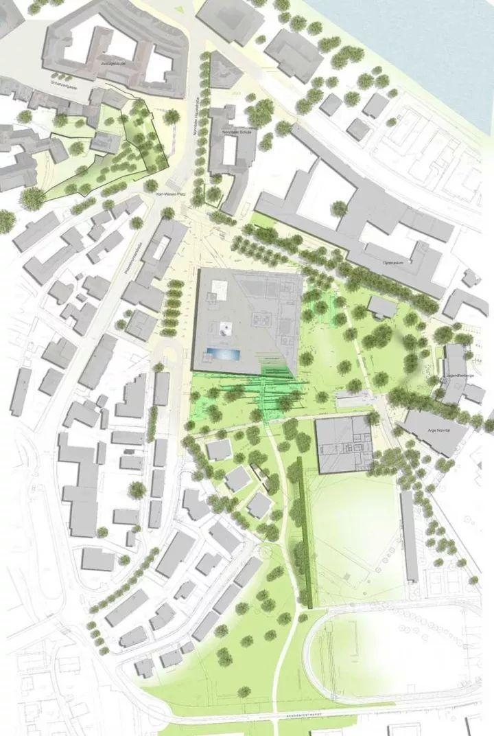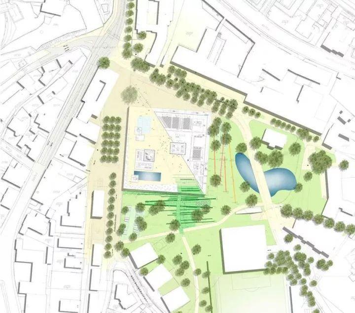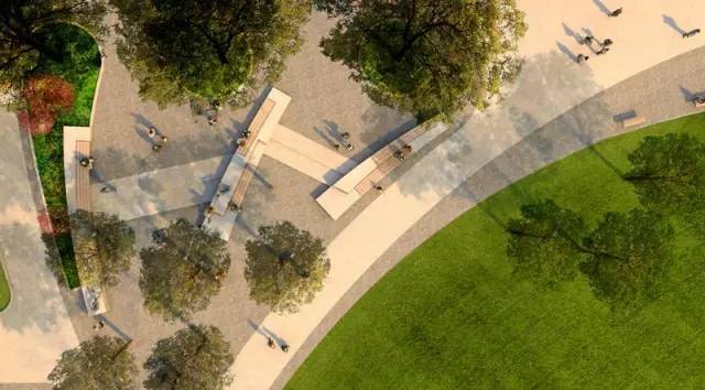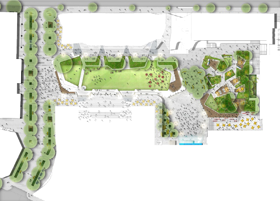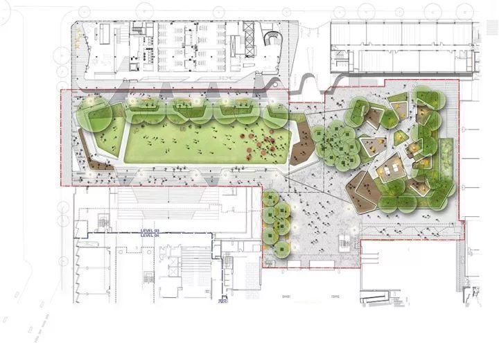 从平面图上我们可以看出空间开合有致,有大草坪空间,也有交流洽谈的小空间。可疏散大量人流,同时也为少数人群提供停留休憩点。