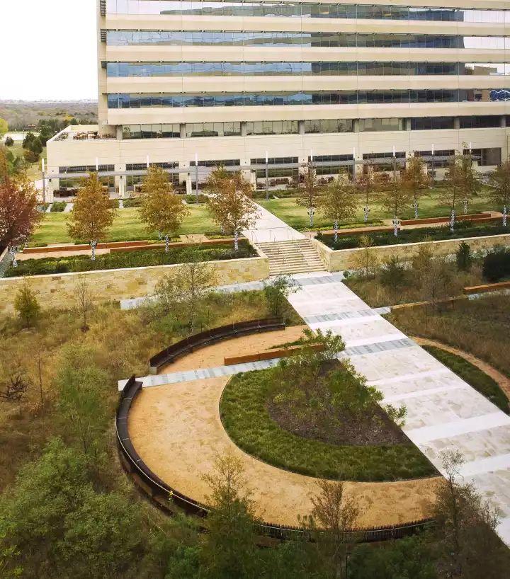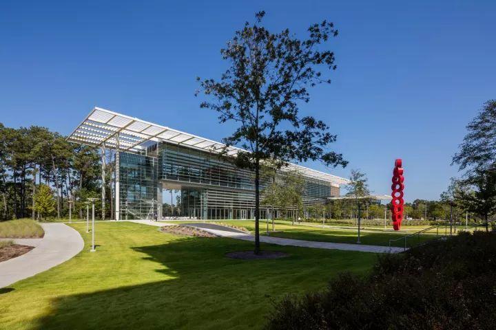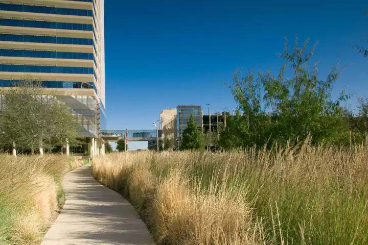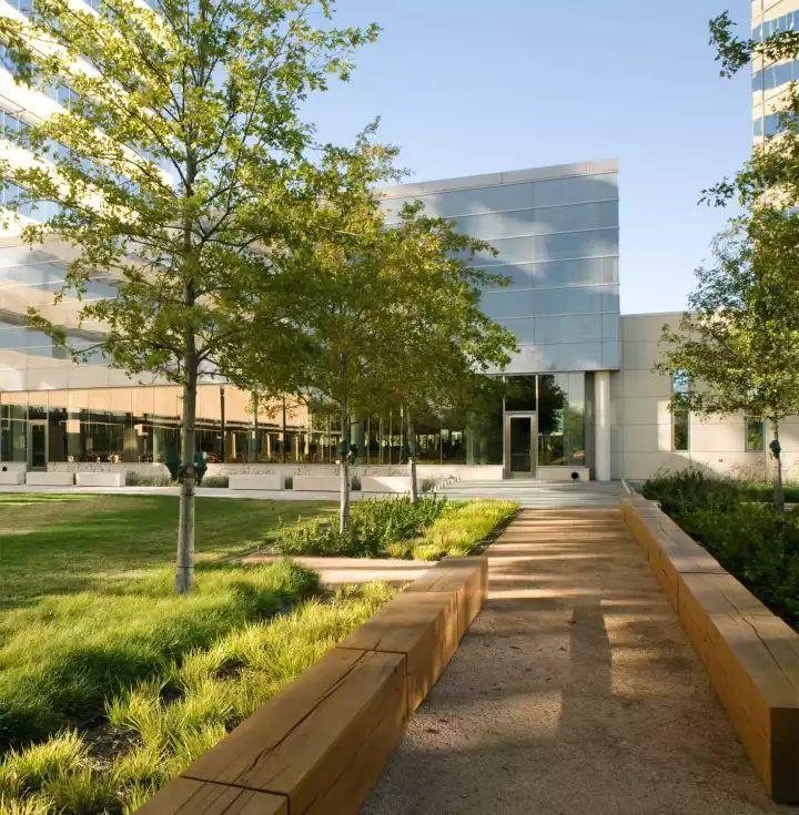 行政办公楼的绿化设计一般采用规则式布局手法,在大楼的前方,一般与大楼的入口相对处,设置花坛、雕塑或大块草坪、喷泉,在空间组织上留出开朗空间,有利于体现景观,突出办公大楼的主导地位。植物配置起丰富景观的作用,衬托主体建筑艺术的美。