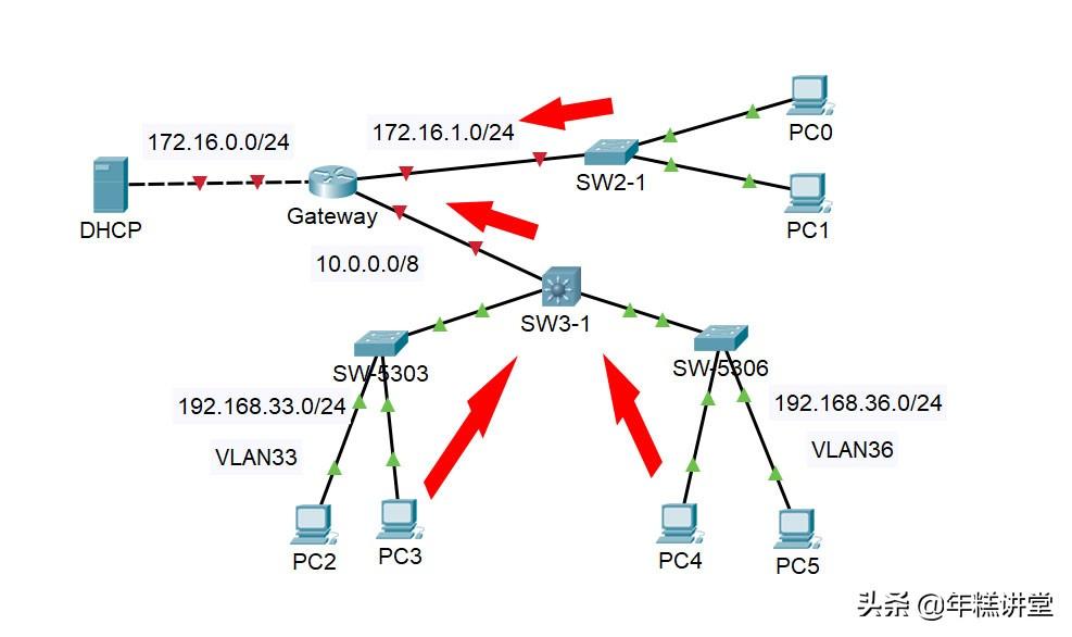 红色箭头标出了“DHCP Discover”需要经过的三层设备,注意这里只关心“DHCP Discover”从哪个接口进入三层设备,只要在这些接口上开启DHCP中继协议即可。DHCP服务器在收到“DHCP Discover”后,需要响应客户端,所以,DHCP服务器必须能够到达客户端所在网段。配置三层交换机的DHCP中继服务
