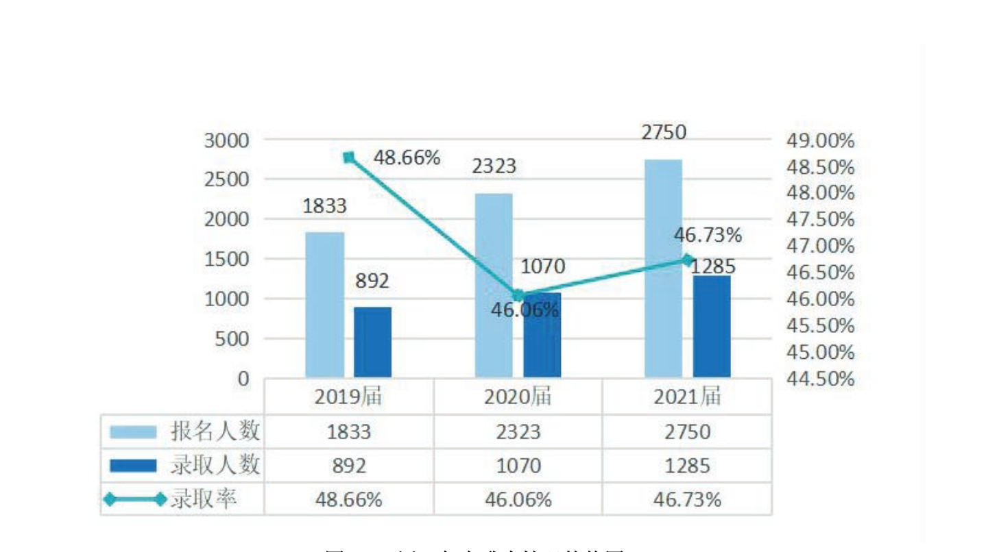 从近三届情况来看,该校专升本报名人数呈现出上升趋势,录取人数随之逐年递增,但录取率没有相应逐年增长,特别是2020年下降较多。具体情况,大家可以查看下面这张图片。