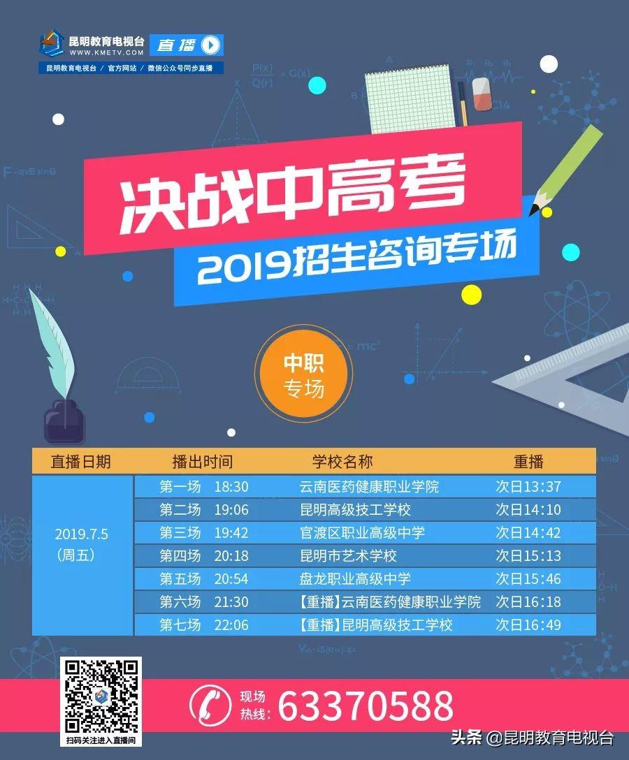 7月1日-6日,每晚18:30起,昆一中、昆三中、昆八中、昆十中、云师大附中呈贡校区、云大附中呈贡校区、昆一中西山学校、云南民族大学附属中学等近40所重点中学、普通中学、职业学校及知名留学机构的校长或招生负责人将走进昆明教育电视台直播间。