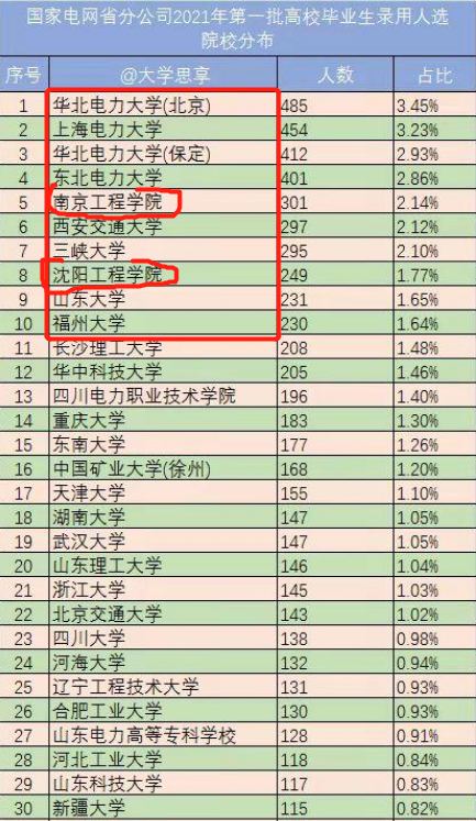 从排名榜单来看,最受国家电网青睐的10所大学分别是华北电力大学(北京)、上海电力大学、华北电力大学(保定)、东北电力大学、南京工程学院、西安交通大学、三峡大学、沈阳工程学院、山东大学、福州大学。