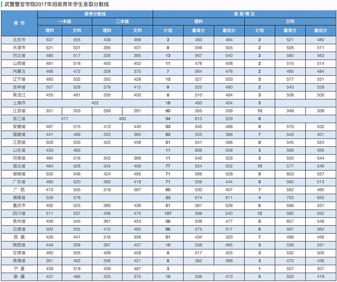 25、武警警官学院2017年在各地录取分数线: