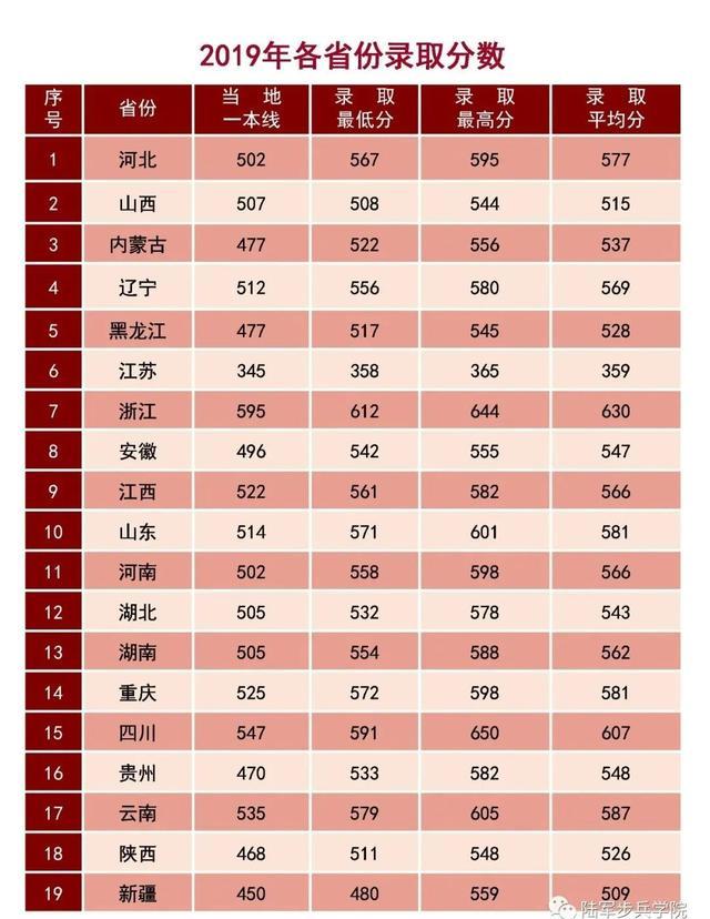 3、陆军步兵学院2019年在各地录取分数线