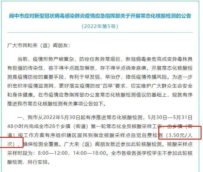 公告原文称“由乡镇(街道)按工作方案有序组织辖区居民到指定核酸采样点自觉自费检测(3.50元/人次)”。