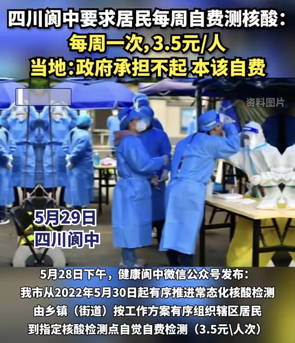 政府财政弱的地方,通常情况下居民收入也不高。所以常态化检测周期的标准不能过高,收钱太频繁就很难执行。阆中是七天一次,别的地方说不定是十天一次也未可知。