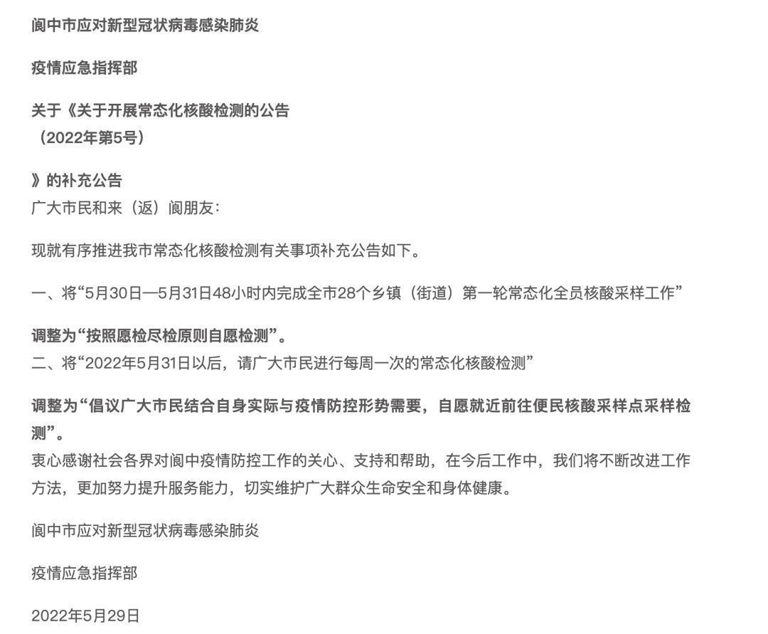 还好,此事在引起舆论关注后,5月29日阆中发布了补充公告:将“5月30日—5月31日48小时内完成全市28个乡镇(街道)第一轮常态化全员核酸采样工作”调整为“按照愿检尽检原则自愿检测”。将“2022年5月31日以后,请广大市民进行每周一次的常态化核酸检测”调整为“倡议广大市民结合自身实际与疫情防控形势需要,自愿就近前往便民核酸采样点采样检测”。