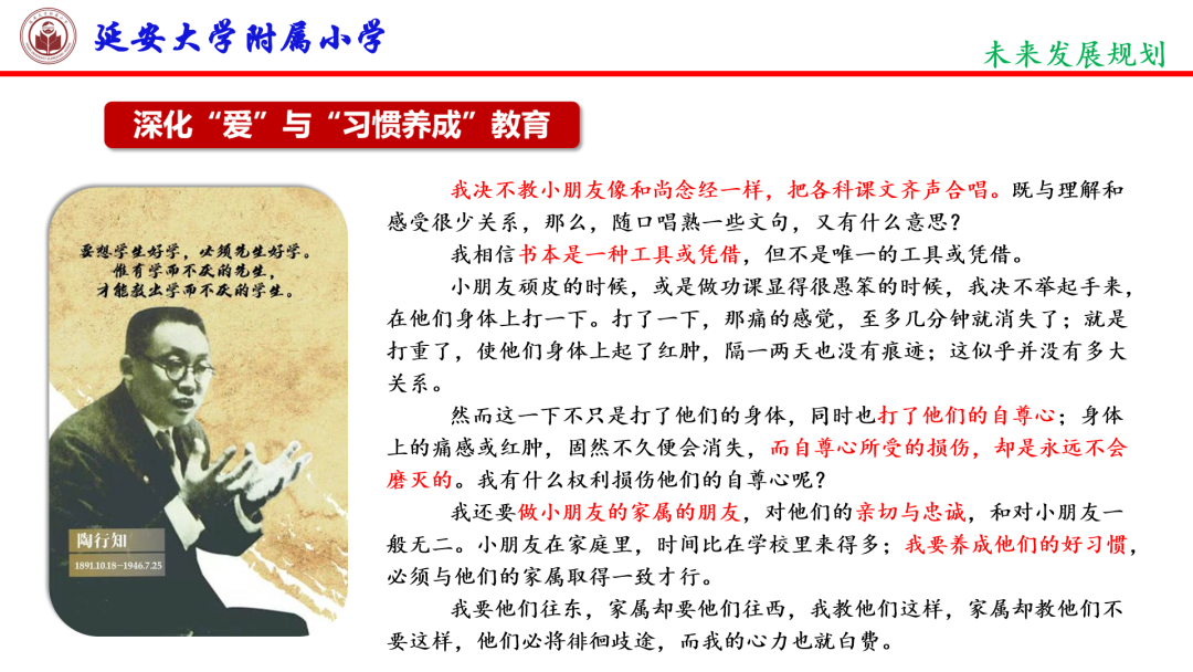 红色教育润色理想信念,延安精神淬发真抓实干。拓宏伟教授立足延安、着眼延大、落脚延大附小,将延安红色文化、延安精神、党的建设等内容与基础教育教育教学具体工作相结合,倡导全体教师发扬自力更生、艰苦奋斗的创业精神,做好立德树人、教书育人的基础工作,将延安精神灵活运用在教育教学的具体环节,树立“师德为先,行为示范”的教育理念,争当仁师、专师、精师。