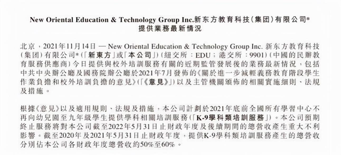 11月15日消息,新东方发布公告,宣布其面向幼儿园至9年级学生的培训服务即将在2021年年底前关闭。这项业务在新东方整个集团的营收中占比50%到60%,也就是说,新东方2022年以后,其营收很可能会下降一半!