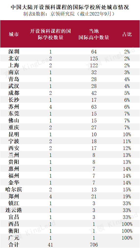 经由京领研究院数据显示,在国内近1200所国际学校中,仅有41所学校开设了预科课程,均为公立学校或者民办非外籍人员子女学校。41所学校中公办学校有20所,私立学校有21所,整体比例相当。