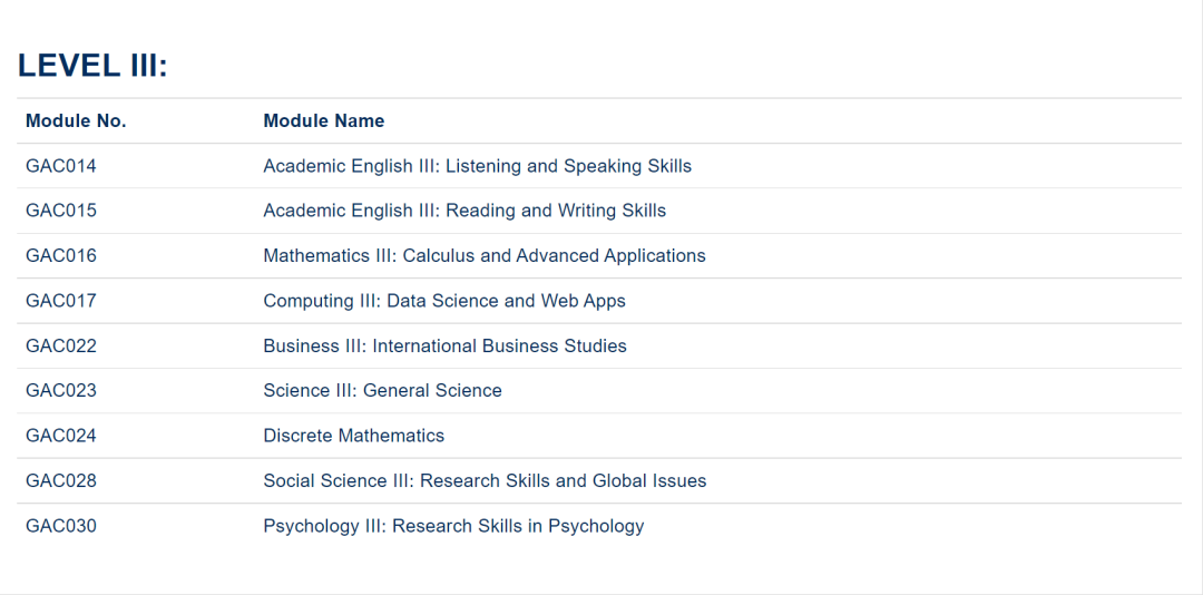 学科内容文理兼备,同时侧重于英语学术应用能力的强化,如每个阶段中都设置学术英语课程(Academic English)。