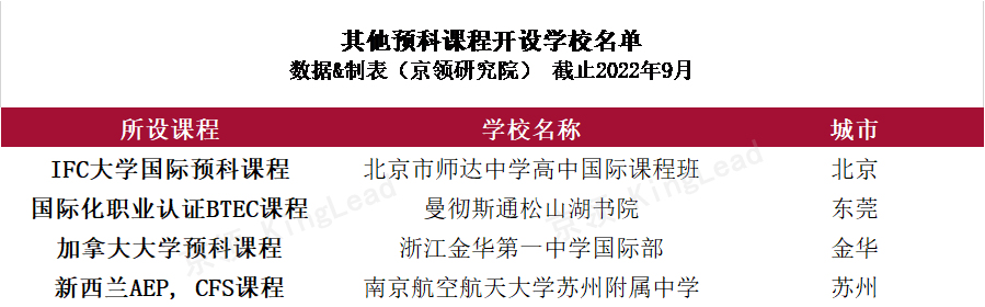 值得注意的是,在以上两种较为普及的课程之外,还有四种预科课程,分别仅在四所学校开设。而这些课程引进时间较短,作为教学创新,搭配校内主流的国际课程设置,为学生提供更多专业化的选择。