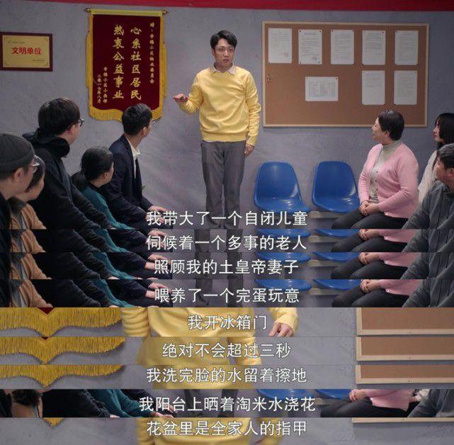 “我带大了一个自闭儿童(指马岱),伺候着一个多事的老人(指马天明),照顾我的土皇帝妻子(指马桃),喂养了一个完蛋玩意儿(指金大海)。我开冰箱门绝对不会超过三秒,我洗完脸的水留着擦地,我阳台上晒着淘米水浇花,花盆里是全家人的指甲。”一番话又解气又走心,赢得业委会所有大妈的阵阵掌声。