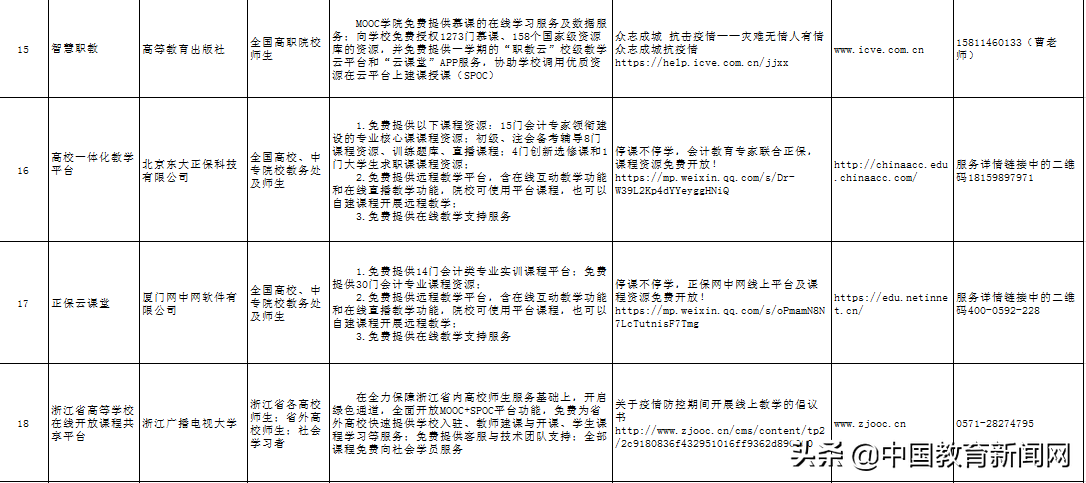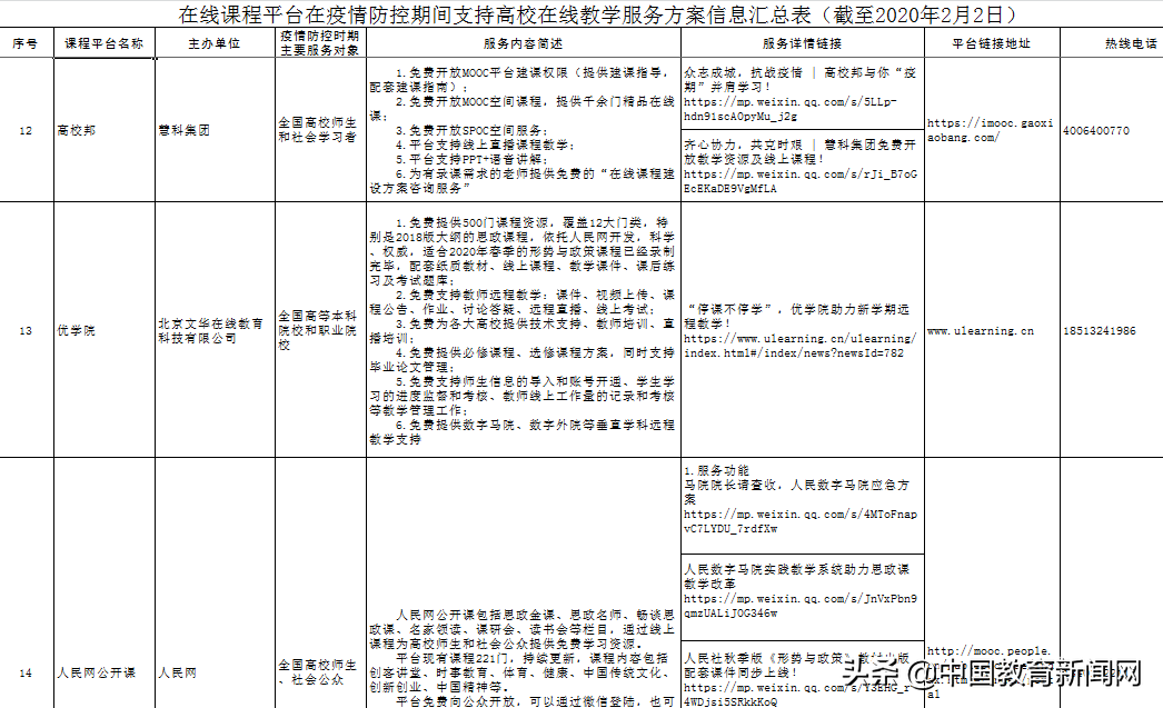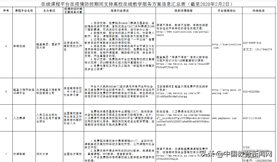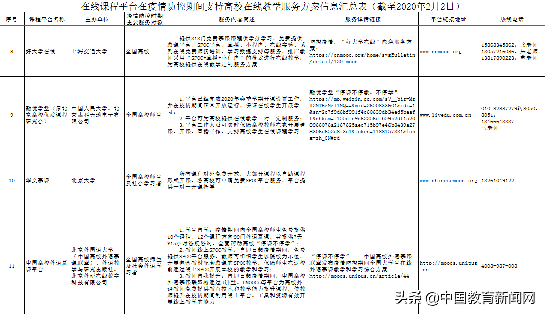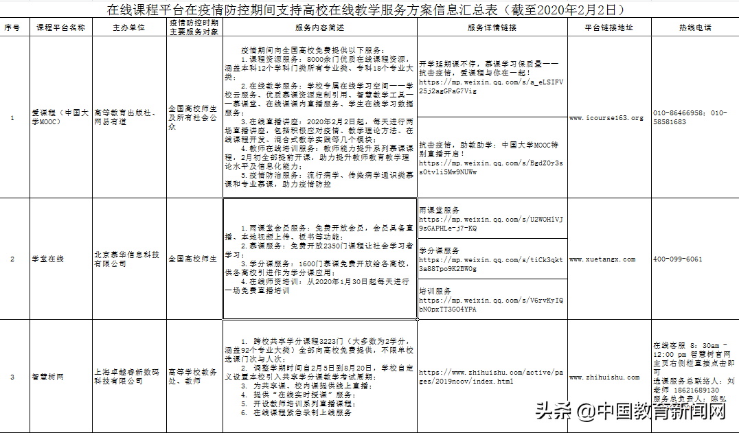 附件:在线课程平台在疫情防控期间支持高校在线教学服务方案信息汇总表(截至2020年2月2日)