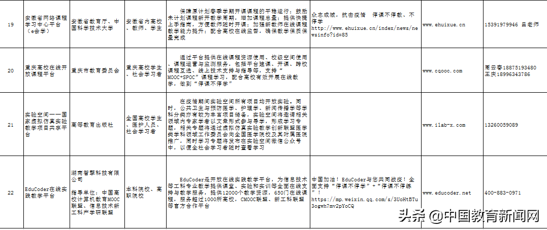1.面向全国高校免费开放全部优质在线课程和虚拟仿真实验教学资源。截至2020年2月2日,教育部组织了22个在线课程平台制定了多样化在线教学解决方案,免费开放包括1291门国家精品在线开放课程和401门国家虚拟仿真实验课程在内的在线课程2.4万余门,覆盖了本科12个学科门类、专科高职18个专业大类,供高校选择使用(见附件)。