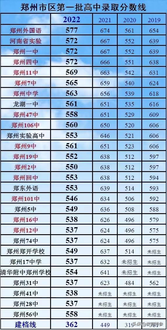在大家的热切期待之下,2022年郑州中招考试第一批高中录取分数线(统招)已经发布,从整体来看,今年郑州中招分数线比较平稳,没有出现学校录取位次大幅度波动的情况 ,不过由于总分下降(中招总分由700分变为600分),今年各所中学录取分数线都有所下降,事实上,这些高中的中考录取难度并没有明显变化。