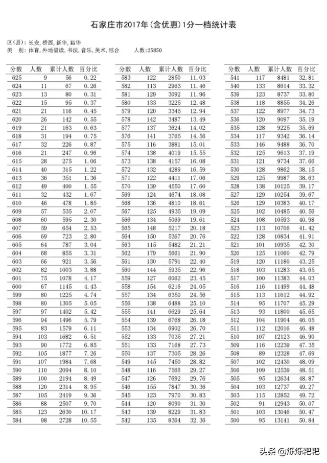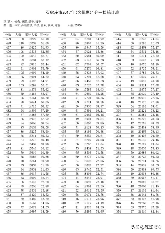 2017年石家庄市四区:长安,桥西,新华,裕华中考分数一分一档
