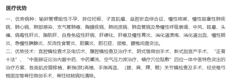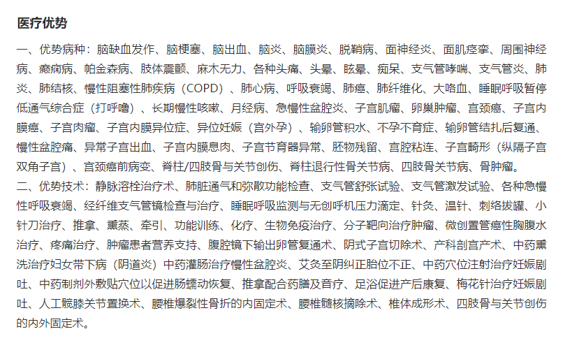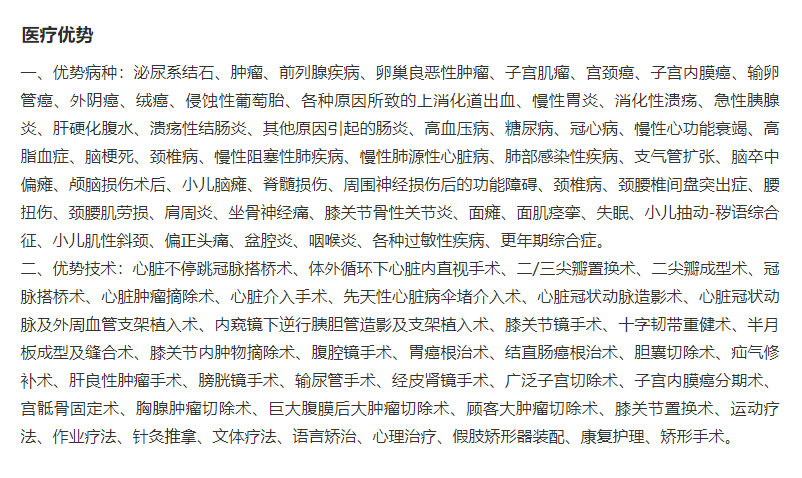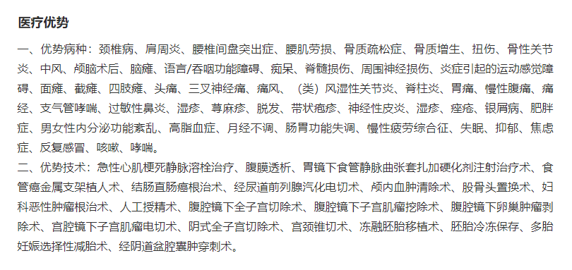 优势学科:生殖医学科、急诊医学科、创伤外科、脊柱外科、病理科。