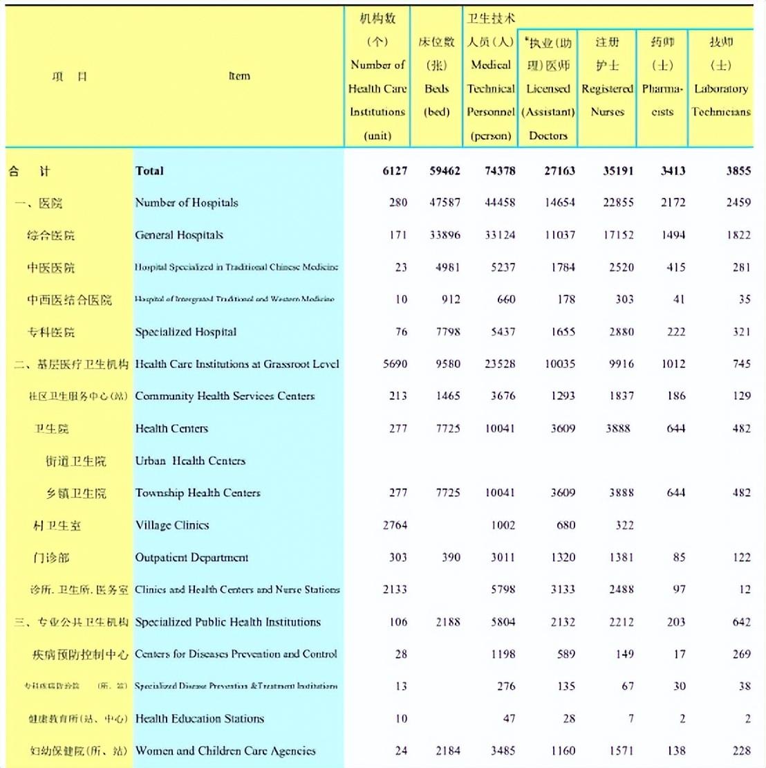 根据海南统计局公布的数据,2020年海南有卫生机构数6127个,医院557个(含卫生院),基层医疗卫生机构5690个,卫生机构床位数59462个,卫生人员总数93875人。2020年海南每万人口拥有床位数59张、医生数27人。