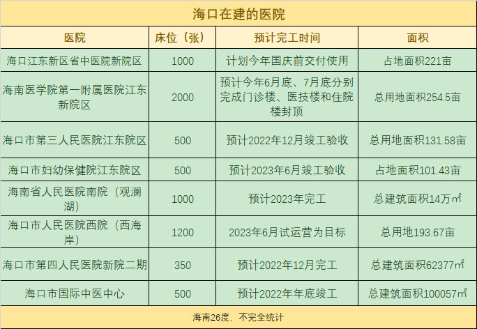 26度君盘点后发现,海口在建的三甲医院有江东新区的海南省中医院、西海岸南片区的海口市人民医院西院。