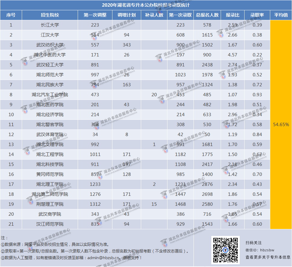 在2020年专升本扩招幅度如此之大的情况下,公办院校的平均录取率依然不是很高。其中,湖北中医药大学的录取率仅为22%、湖北经济学院、武汉轻工大学、长江大学、江汉大学的录取率也是不到40%。